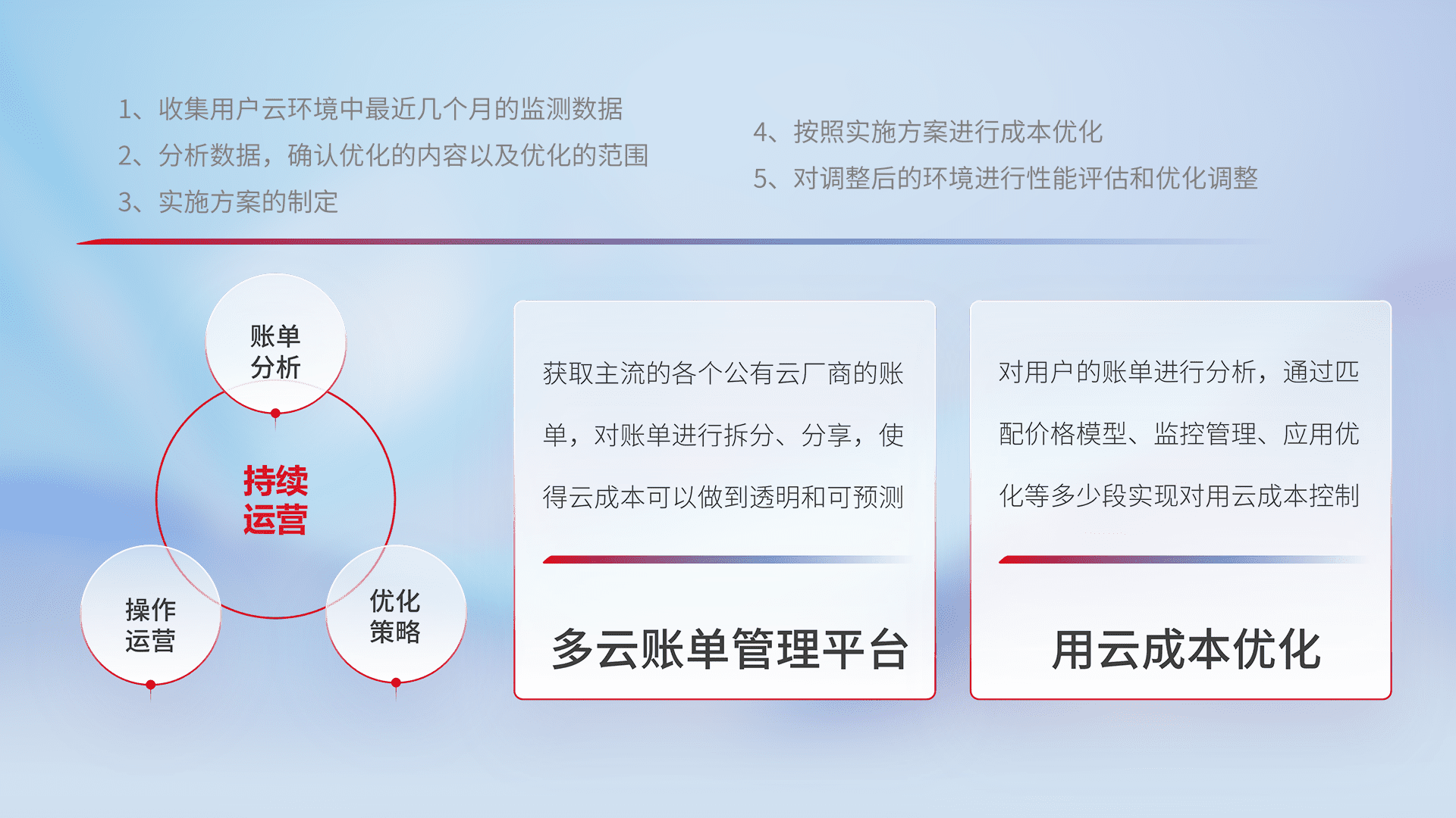 通过多云纳管,,以统一的资源数据模型把客户的云资源进行抽象和封装,,进而实现对多云资源的统一操作,,,,保障云资源管理的可靠性、、、、稳定性与可用性。。。量身定制化运维内容,,,配置、、开发运维、、补丁管理、、、备份、、、监控、、、、认证和访问管理、、、、审计和日常巡检等,,保障在用云过程中的可靠度,,,,稳定度以及高可用率。。。
